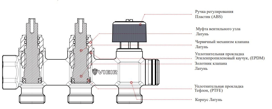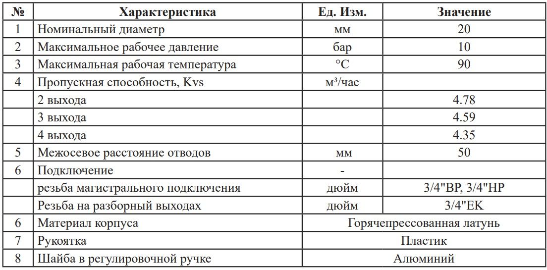 Каждый отвод оснащён запорно-регулирующим вентилем, позволяющим отключить или отрегулировать поток воды. В регулировочные ручки вентиля установлена алюминиевая шайба с названием потребителей и двухсторонняя информативная пластина красного/синего цвета, которая обозначает горячую/холодную воду.