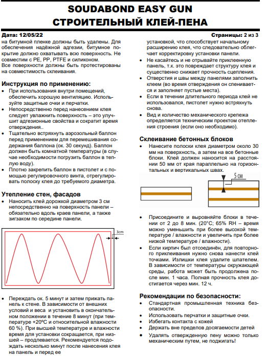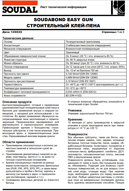 SOUDABOND EASY GUN — быстросохнущий полиуретановый клей в аэрозольной упаковке, разработанный для профессионального использования при монтаже гипсокартонных плит и теплоизоляционных панелей.