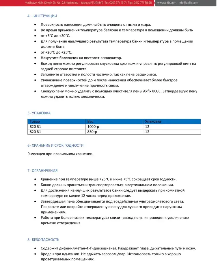 Akfix 820 – монтажная пена с огнестойким составом. Предназначена для использования на объектах с высокими требованиями по противопожарной безопасности. Превосходная адгезия в зависимости от, влажности воздуха и др. Однокомпонентная.