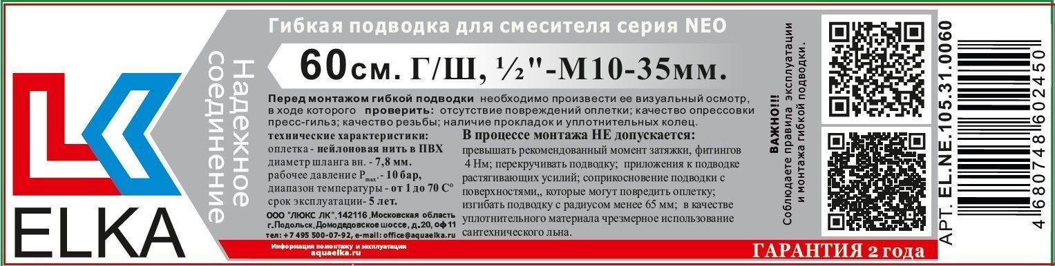 Гибкая подводка NEO обеспечит вам гарантию безопасной и долгой эксплуатации вашего оборудования.